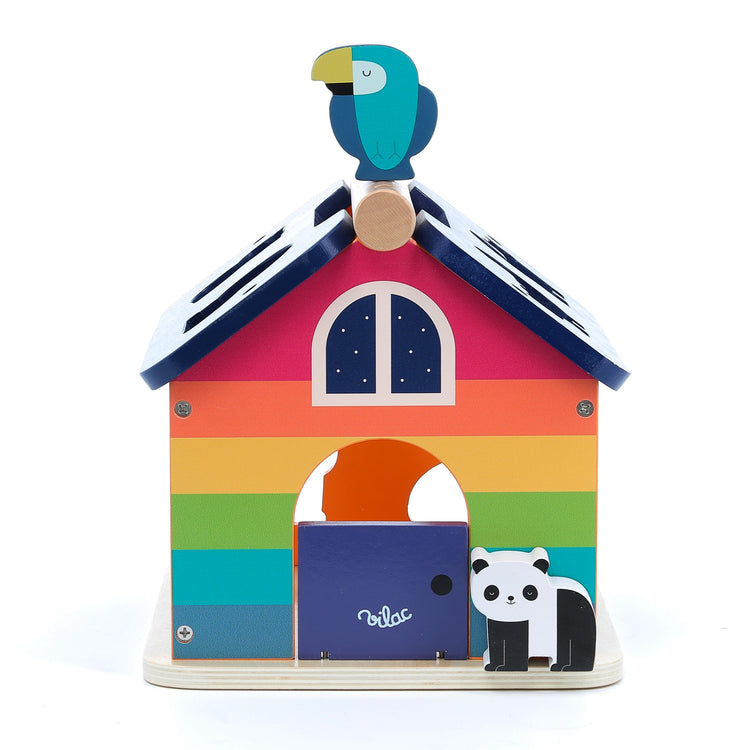 • Packshot avant : maison arc-en-ciel VILAC avec toucan, boîte à formes Montessori.